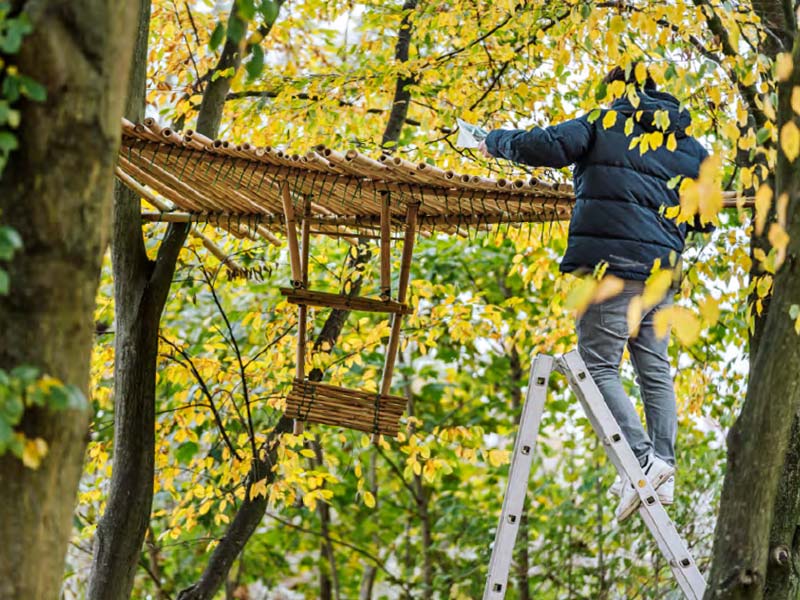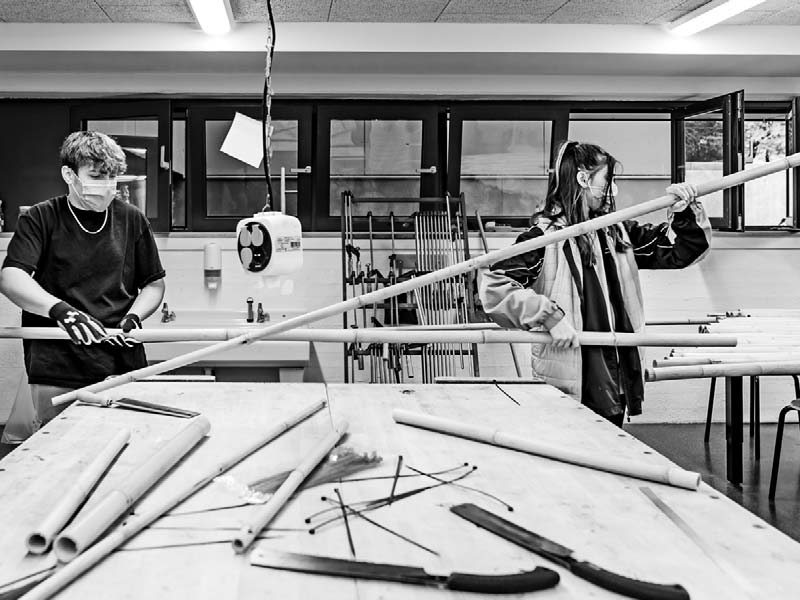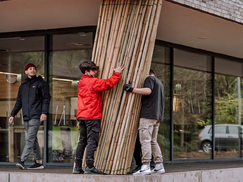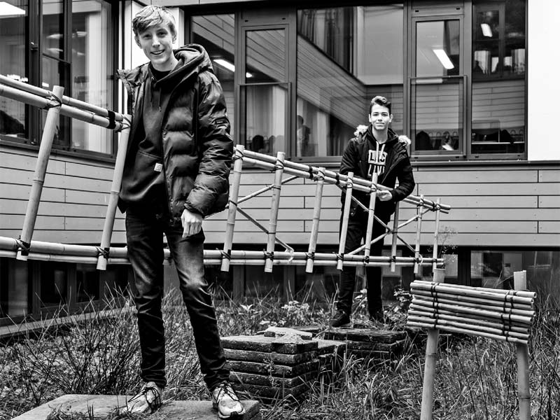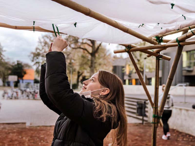 Zehn Schülerinnen und Schüler des 10. Jahrgangs der IGS Kreyenbrück folgten der Einladung zu einem offenen Kunstprojekt in Kooperation mit der Kunstschule. Die Grenzen des Möglichen wurden weit gesteckt – als gesetzt galt nur das Material in Form von Bambus, Stoffen, Kabelbindern und Klebeband. Die Kommunikation mit den Künstlern, die beratend zur Seite standen, war rein digital per Videokonferenz angelegt. Alle Teilnehmerinnen und Teilnehmer waren dementsprechend engagiert und mutig, um sich auf ein solches Vorhaben mit vielen Fragezeichen einzulassen. In Workshops und Arbeitsgruppen entwickelten die Schülerinnen und Schüler ihre Ideen zur Verschönerung, Verbesserung und Verwandlung des Geländes vor der Schule.