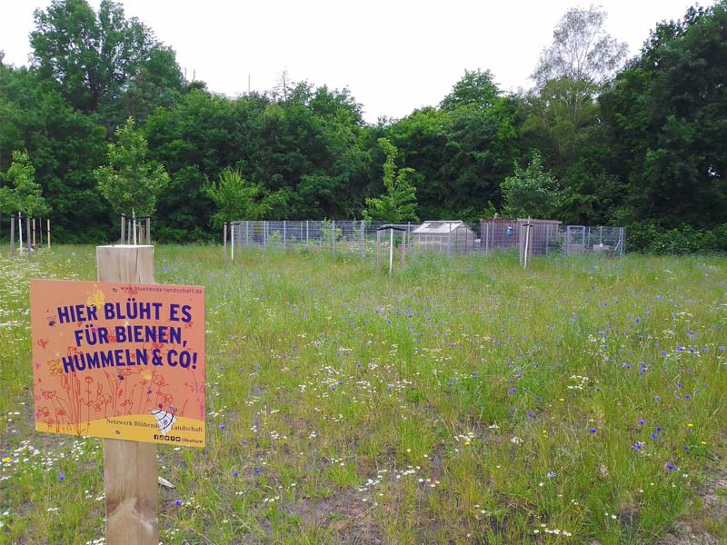 Im Rahmen unserer Bewerbung als „Umweltschule in Europa“ wollen wir unser Schulgelände möglichst naturnah gestalten. Dazu wurde bereits im Herbst 2019 eine Streuobstwiese mit heimischen Obstbäumen angelegt und dadurch der eingezäunte Bereich unseres Schulgartens erweitert. Nun wurde in Zusammenarbeit mit dem „Amt für Umweltschutz und Bauordnung“ eine ca. 1000 m2 große Blühfläche im Bereich der Streuobstwiese angelegt. Neben den schuleigenen Honigbienen lockt diese Fläche jetzt jede Menge heimische Insekten an. Die Pflege der Blühfläche erfolgt durch unsere Schüler und Schülerinnen in Zusammenarbeit mit dem „Amt für Umweltschutz und Bauordnung“.
