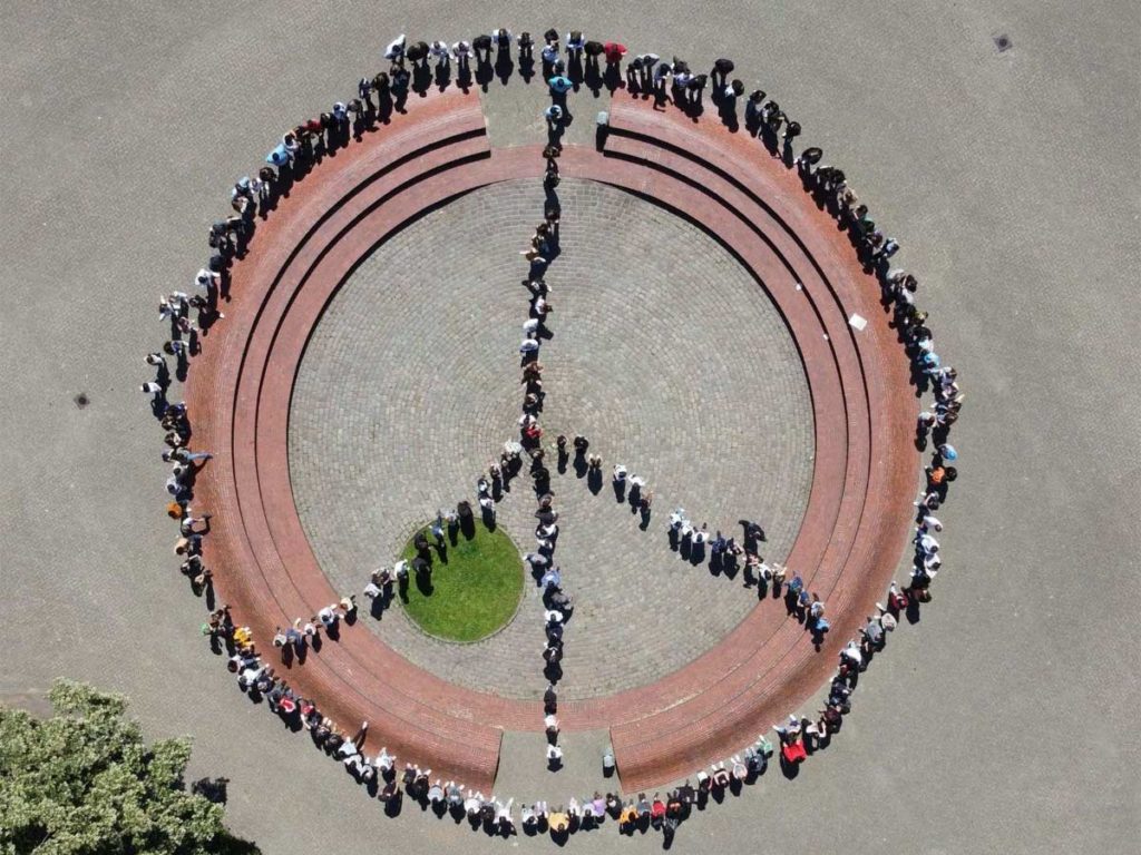 Herausgekommen ist ein Themen-Tag, an dem u. a. ein gemeinsames Drohnenfoto mit dem Friedenszeichen auf dem Schulgelände gemacht wurde. Außerdem wurde gemeinsam eine Schweigeminute abgehalten und viele Kolleginnen und Kollegen sind dem Wunsch der SV, den Ukraine-Krieg auch im Unterricht zu thematisieren, nachgekommen.